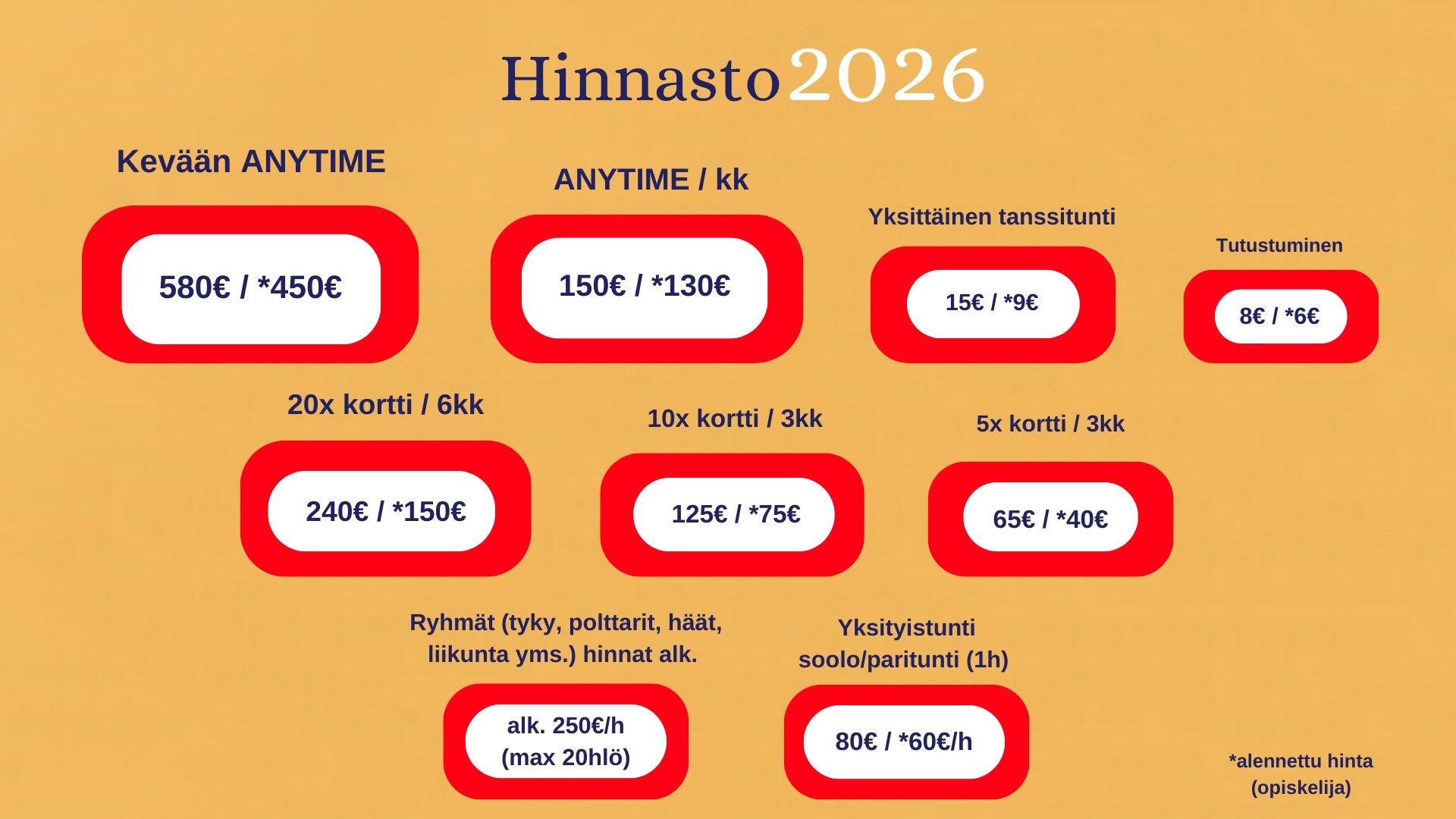 TYKY-tunteja, polttariopetusta, yksityistunteja sekä tanssiryhmän esityksiä.